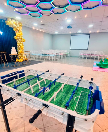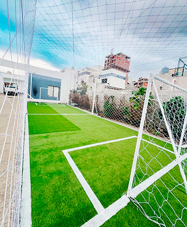 Porque la diversión no termina bajo techo, nuestro espacio cuenta con una cancha de césped sintético totalmente equipada para jugar y pasar momentos inolvidables.