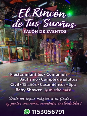 🎉 Bienvenidos a El Rincón de los Sueños 🎉 En el corazón de Martín Coronado, te espera un lugar donde la magia, la diversión y la alegría se encuentran para crear momentos únicos. Nuestro salón está pensado para que grandes y chicos vivan experiencias inolvidables, con cada detalle diseñado para que tu evento sea tan especial como lo imaginaste. Aquí, los sueños se hacen realidad… ¡y se celebran a lo grande! ✨