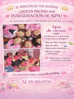 Bienvenidos al Salón Cumpleaños Infantiles!”Salon q mejor comunica y resuelve todo.” Nuestro Servicio Incluye Profesionales a cargo Coordinación y organización del evento Invitación Virtual Vajilla y manteleria Just dance Animación ( 2 coordinadoras ) Wifi Asistencia médica Disco Piñata Regalo al homenajeado Helados/bolsitas ( según la época del año) Personal de cocina y atención para adultos Dos equipos de mates durante el evento Los adultos traen comida, bebidas,servilletas y la torta.Por favor si pasan de los 40 adultos avisar con anticipación !! Menú Infantil Snacks, Panchos, Pizzetas Cereales dulces, Agua, Jugo y Gaseosa ¡Consultá también por el menú saludable! con frutas de estación,, rodajitas de choclo, Tomatitos Cherri, Pizza, Gelatina, Cereales dulces, jugos, agua y gaseosa. Consulta otros Combos Arma tu propio menú para adultos .(pizza, empanadas, bondiola, sándwich de pollo, jamón, queso y tomate, medialunas rellenas, salchichas envueltas y mucho más . ¡Recordá! Consultar disponibilidad para tú evento y reservar la fecha con anticipación. Con una seña congelamos el precio .SALÓN EL RINCÓN DE TUS SUEÑOS .