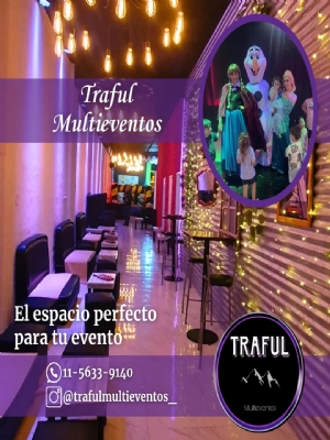 Bienvenidos a TRAFUL MULTIEVENTOS salón de Fiestas Infantiles & Sociales ubicado en Caseros. Contamos con todos los servicios y juegos, para que vos y tus invitados puedan disfrutar de este día tan especial. No dudes en consultar disponibilidad y reservar tú fecha con anticipación.