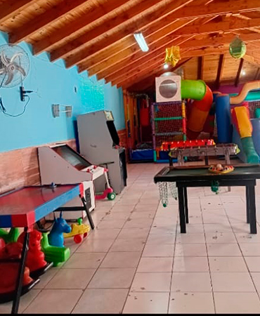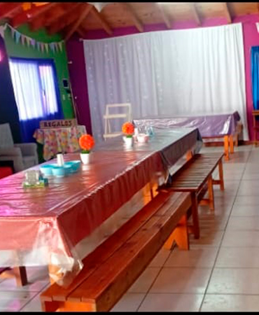 Bienvenidos al Salón Cumpleaños infantiles, Bautismos, Comuniones, Baby Shower, Egresados, Egresaditos, Cumpleaños de Adultos, Reuniones Familiares. Nuestro Servicio Incluye El salón  posee un amplio y cálido  espacio, para 35 adultos,  en caso de ser más personas consultar  Mesa de tejo,  2 metegoles,  cama elástica chica, inflable, Estructural tobogán con pelotas  juegos de plaza blanda para menores de 6 años ,  máquinas de juego arcade de pelea,  1 autito bombero y una moto mecánico, pool,  juegos didácticos para menores de 6 años, Jenga gigante y pequeño. Sapo, Carpa tipi,  Xbox, sector de disfraces, sector de pintorcito.( Tiempo de uso de estos 3 juegos son de 2 horas). El salón cuenta con 3 mesas blancas de candy Bar para la torta y los dulces, 3 mesones, manteles , bancas, cocina equipada con heladera, microondas , cocina, platitos para torta, platos de plástico, cubiertos metalicos, vasos, olla ( para hervir  salchichas), pizzera, tablas, espátula  y cuchillo para la torta, recipientes/compoteras para snacks, etc  que incluyen como vajilla. LOS PRECIOS COMBO 1 El salón incluye todas las instalaciones del pelotero mencionados anteriormente, con todos los juegos y vajilla. Tarjetita de invitación virtual. Uso de chulengo Limpieza incluida del salón. Las bebidas y comida están a cargo del responsable de cumple.    Lunes a domingo $150.000 COMBO 2 Salón con todos los juegos y vajilla. Maquillaje Artístico para los niños. Uso de chulengo. Candy bar ( recipientes blancos para colocar las golosinas, chupetines, Magdalena, etc) Tarjetita de invitación virtual. Limpieza incluida del salón.      Lunes a domingo $170.000 COMBO 3  Servicio de mozo, cuidado de niños durante el cumple y 4 jarras de jugo. Tiene un costo de $20.000 HORARIOS de Lunes a Viernes:                         14 hs a 17 hs 18 hs a 21 hs Sábados, Domingo y Feriados 11 hs a 14 hs 15 hs a 18 hs 19 hs a 22 hs  Horarios de promoción  lunes a viernes por la mañana  10 hs a 13 hs   Combo 1 $100,000.   Consultar horarios nocturnos. Importante! Se podrá concurrir media hs. antes del evento para decorar la pared y la mesa dulce. PARA CONFIRMAR LA RESERVA  DEBERÁ  ABONAR EL 50% del combo que eligió, en efectivo o por transferencia como desee. Está es la única forma de reservar la fecha y el horario elegido. Una vez realizada la seña, está no se devuelve..!!! Se podrá cambiar la fecha por cualquier eventualidad, en algún horario disponible... El alquiler de las instalaciones es por 3 hs. En caso de querer 1 hora adicional la misma tiene un costo de $60,000. Se debe de avisar con anticipación. Se debe entregar el salón en condiciones, ya sea los juegos, muebles,las pelotitas dentro del pelotero, las vajillas en la cocina, etc. El locatario debe responder por rotura o pérdidas en juegos o instalaciones. El salón no se responsabiliza de pérdidas de objetos personales. Al momento de finalización del evento se tendrá una tolerancia de 10 minutos para desocupar el salón caso contrario se abonará media hora adicional.